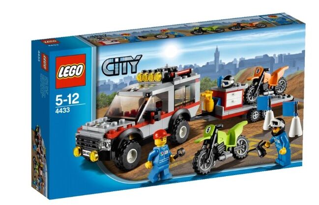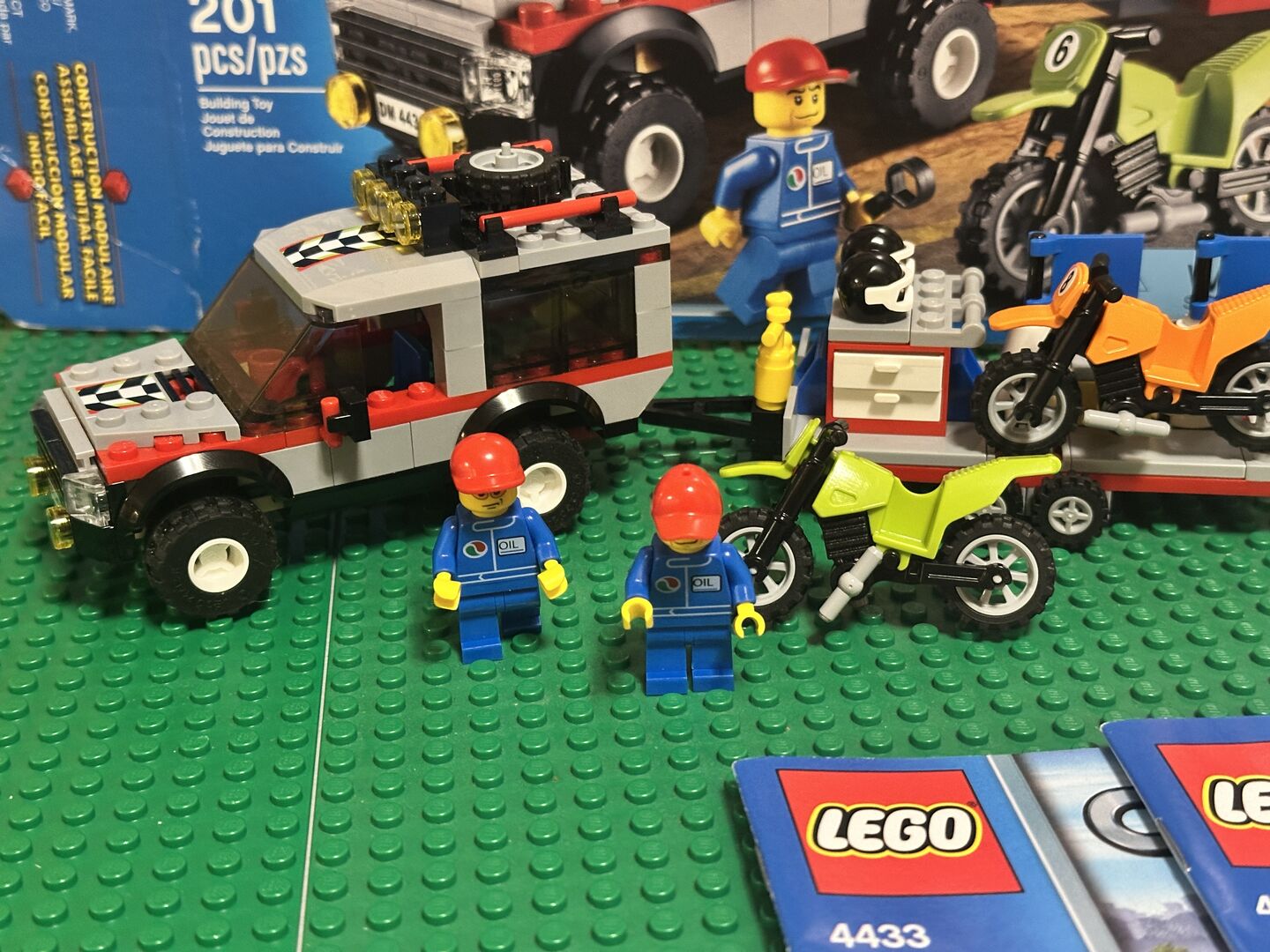 The set includes a 4-WD pick-up truck and a trailer capable of carrying two dirt bikes (one green and one orange) along with two minifigures (both mechanics/racers) in matching driver outfits. The truck itself features a removable top, functional hitch, front headlights and “KC-style” roof lights, a spare tire on the roof, and space to seat both minifigures. The trailer has flip-down ramps for the bikes, tool-storage compartments, and comes with a variety of accessories: two helmets, repair tools, a spare tyre, fire extinguishers, cones with flags - this gives it a feel of a complete “race day / off-road support” rig. This set has been minimally used and remains in excellent condition. Stored in a smoke-free home and kept well protected from light in secure, lidded storage container.