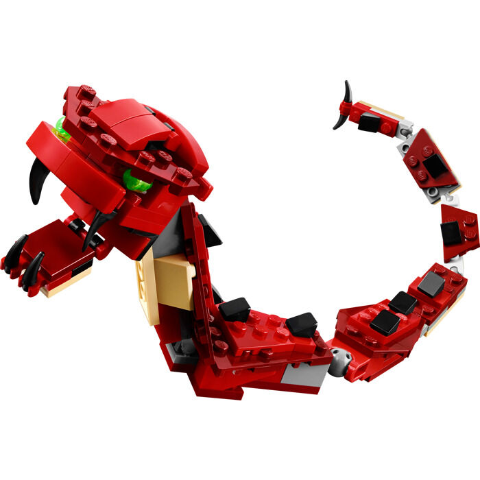 Conquer the sky with the fearsome fire-breathing dragon from the Red Creatures set! This awesome 3-in-1 model features a classic red, tan and black color pattern, large movable wings, a long scaly tail, flames shooting out of its mouth, horns, long claws and bright green eyes. Stomp through the forest and climb huge mountains! When you've had enough of experiencing countless new legends and fantastic tales, simply transform the dragon into a menacing snake or a 6-legged scorpion.